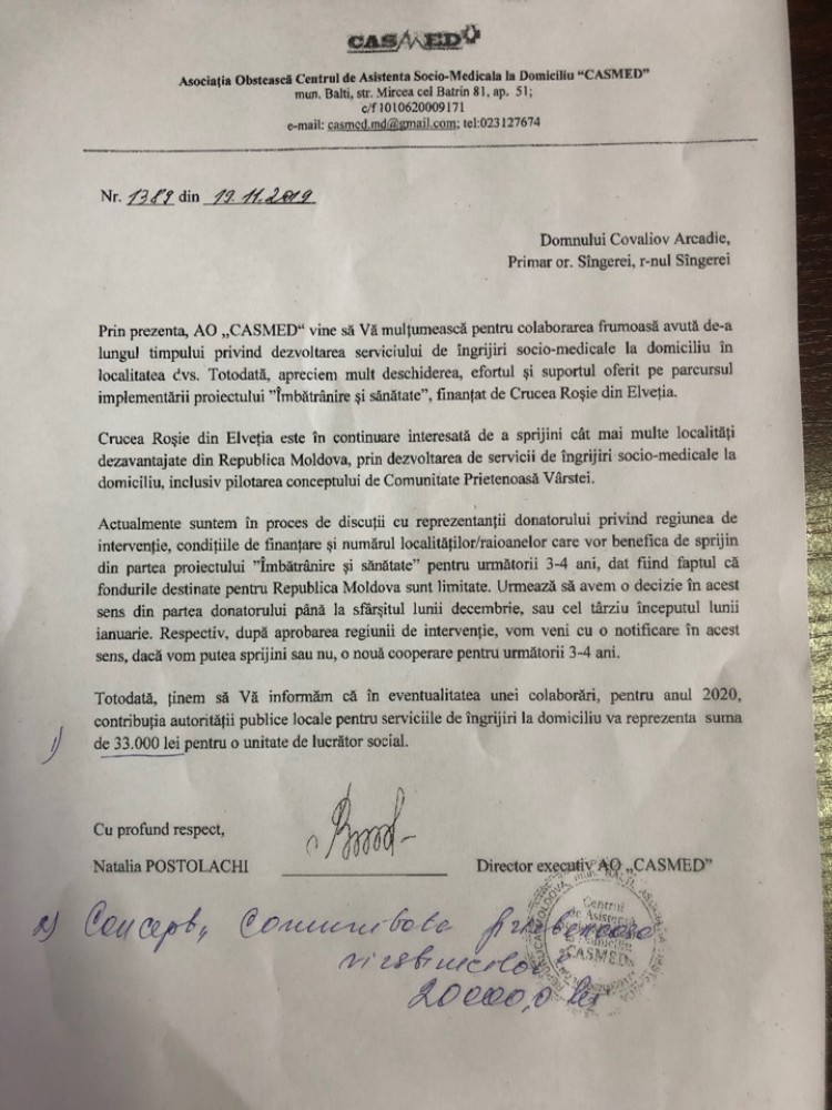 În scopul unei eventuale colaborări Crucea Roșie din Elveția este și în continuare interesată de a sprijini localitatea noastră pentru următorii 3-4 ani în cadrul proiectului ,, Îmbătrînire și sănătate “. Astfel, urmează contribuția APL-ului pentru serviciile de îngrijire la domiciliu pentru anul 2020 în sumă de 33.000 lei pentru o unitate de lucrător social, cît și contribuția a 20.000 lei pentru implimentarea cantinei sociale pentru perioada ianuarie – aprilie 2020.